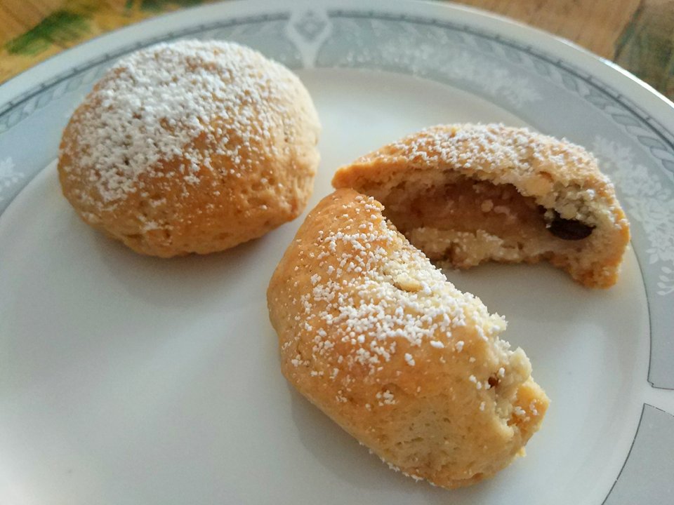 Πλάθουμε μπαλίτσες, τις ανοίγουμε και βάζουμε μέσα 1 κουταλάκι από τη γέμιση στην καθεμία.